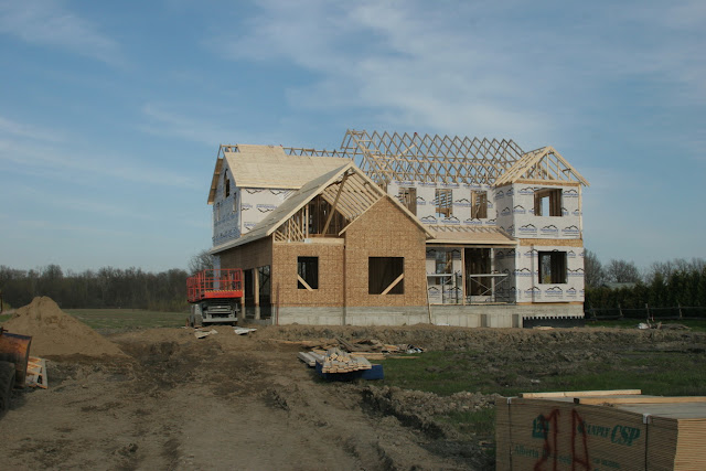 Despite the outrageous amount of rain in southern Ontario this spring, we've made some decent progress in two months. Of course this is just the front exterior of the house. Inside the house, we have walls being clad in drywall and mudded, plumbing being installed, electrical and network cable being wired and a gas fireplace finding its new home. As well, the cabinets for the kitchen, butler's pantry, bathrooms, sewing room and library are being built. Soon the flooring, lighting, plumbing fixtures and inside trim will be installed.